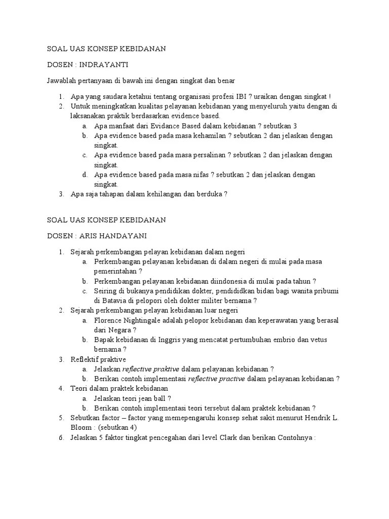 Contoh soal uts konsep kebidanan semester 1. Ems(erlangga medical series) original deskripsi liat foto aja ya gan jual seri praktik kebidanan . View soal.docx from communicat misc at university of notre dame. Jelaskan yang dimaksud dengan filosofi . Teori yang mendukung praktik kebidanan adalah.